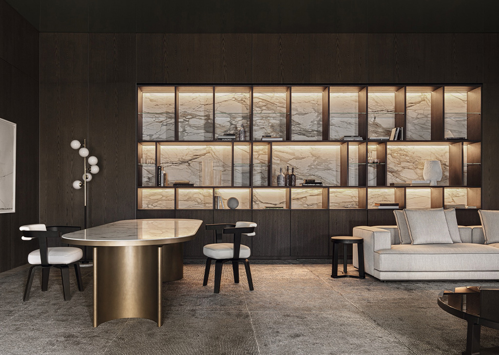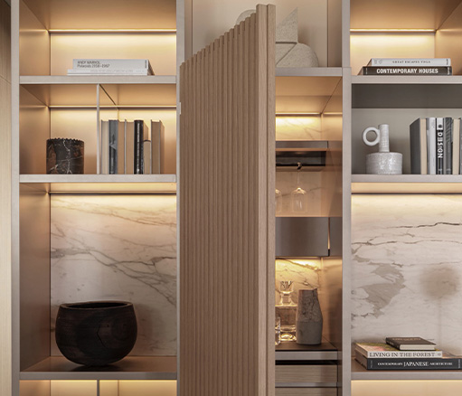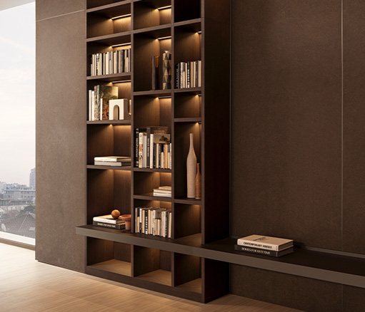 505 UP 系统可选配卡拉卡塔维纳维奇亚纹理陶瓷,随着时间的推移,这种材料越来越受到人们的关注。这种陶瓷最初是在哈利酒吧模块中使用,厚度为 4 毫米,既耐用又美观。它与作为支撑的三聚氰胺面板完美融合,505 系统的所有背板以及展示模块背板都采用了这种材料