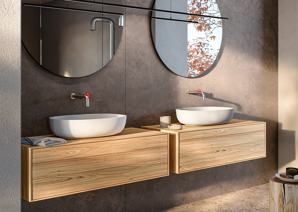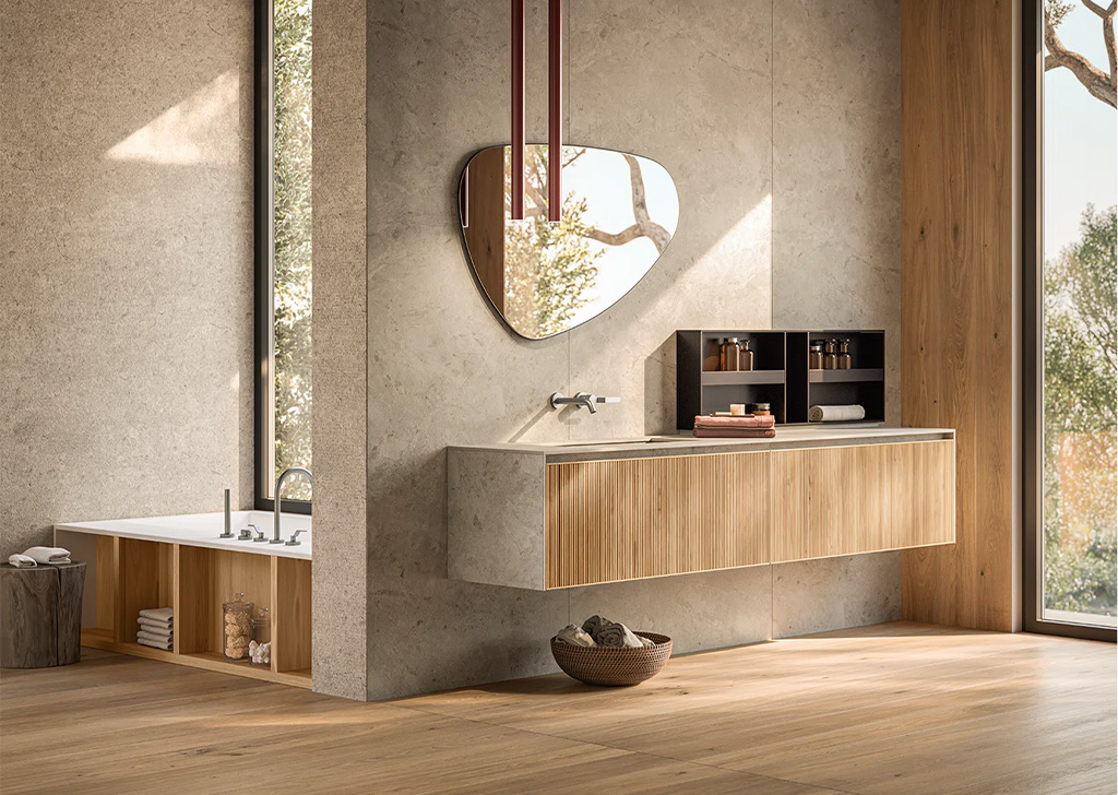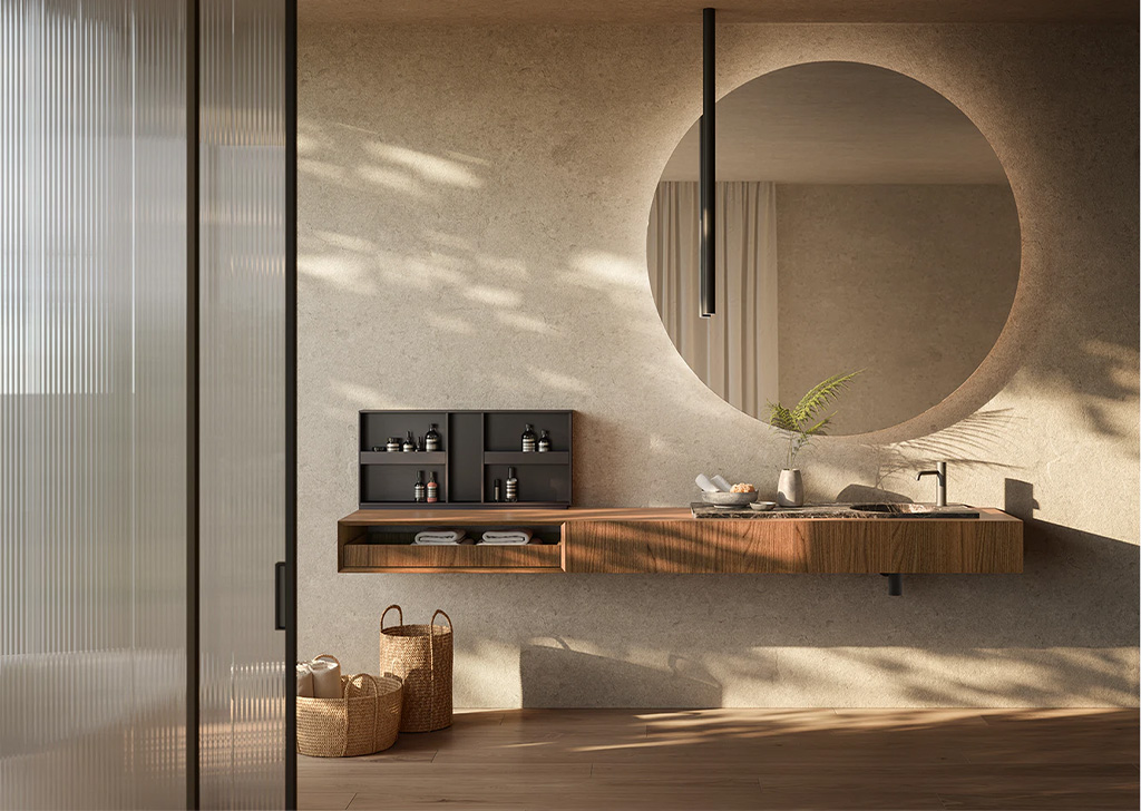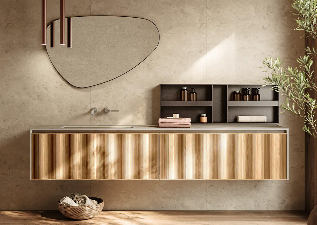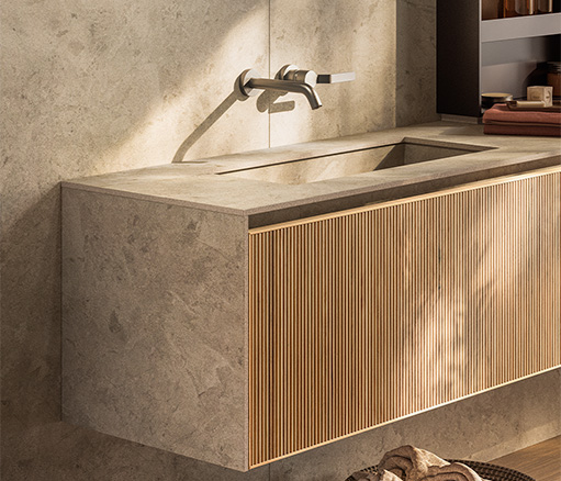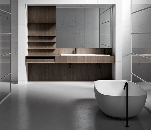 Upper 系统代表了浴室装饰的优雅和性能的顶峰。将盥洗台、开放式储物柜以及带有置物架和镜子的墙板无缝整合在一起,实现了多样化和个性化