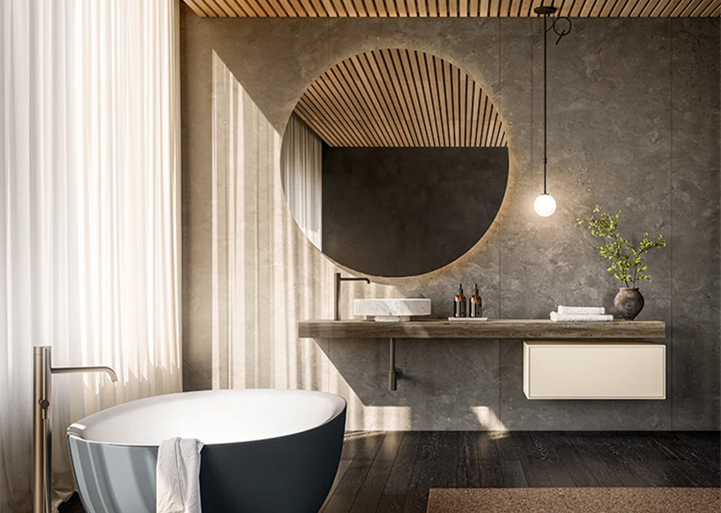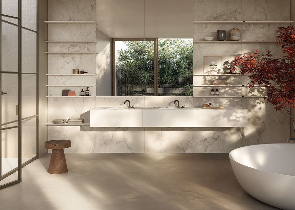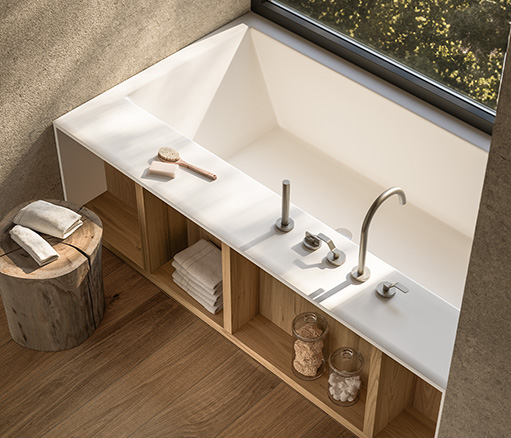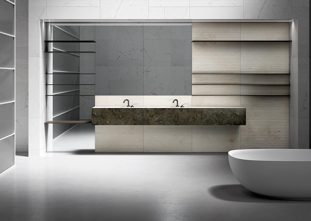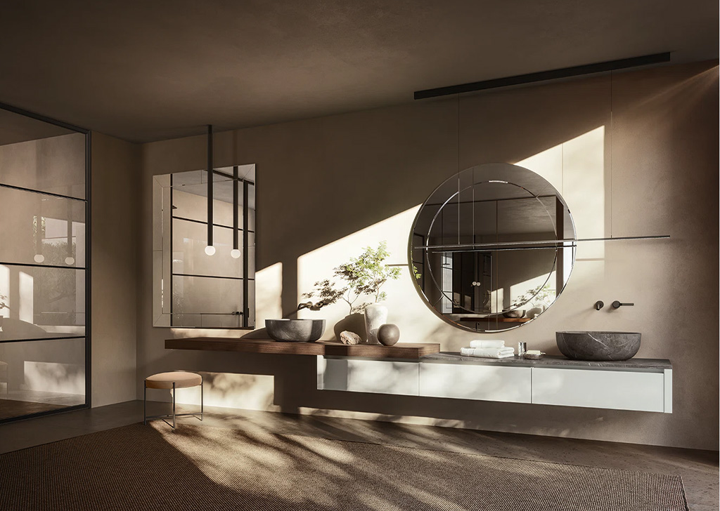 Upper 系统代表了浴室装饰的优雅和性能的顶峰。将盥洗台、开放式储物柜以及带有置物架和镜子的墙板无缝整合在一起,实现了多样化和个性化