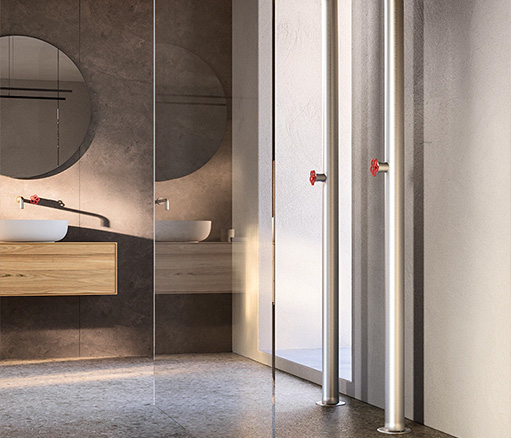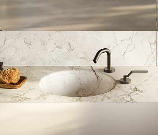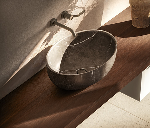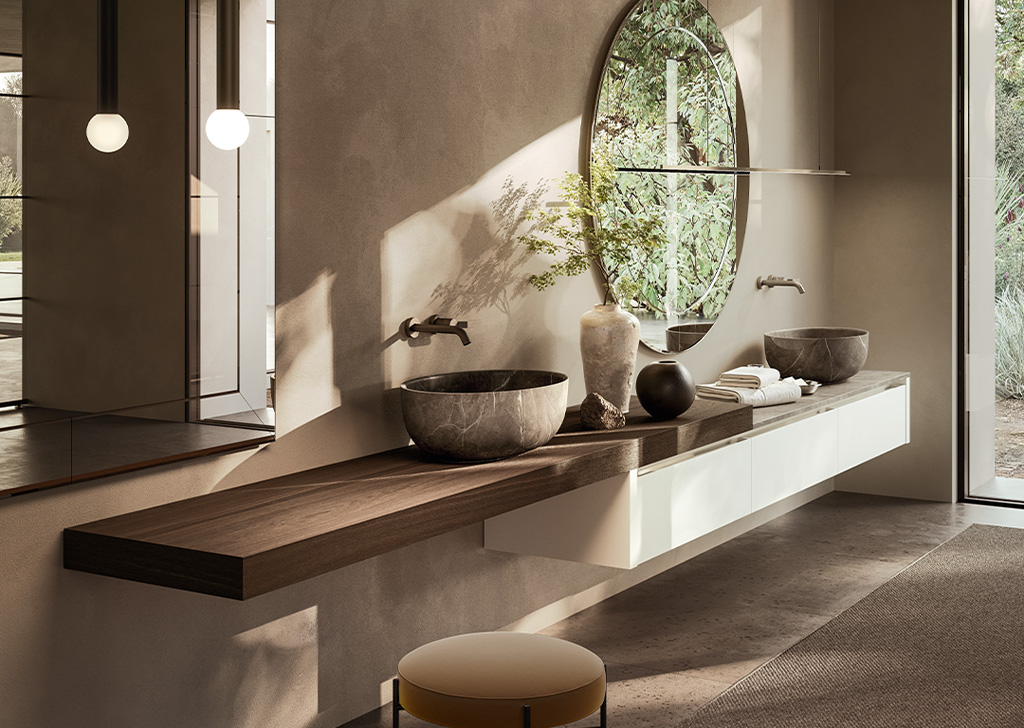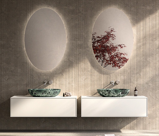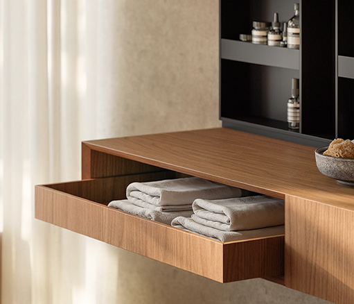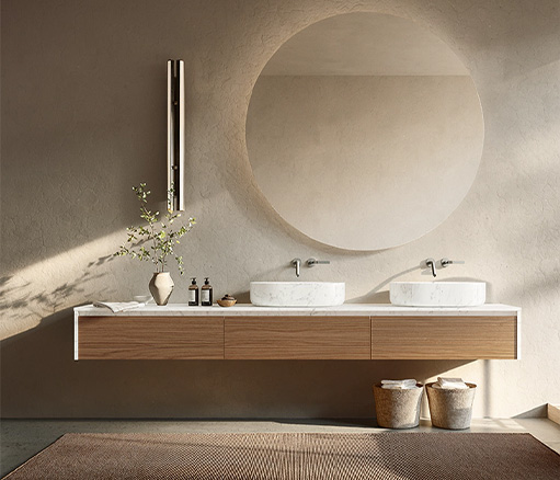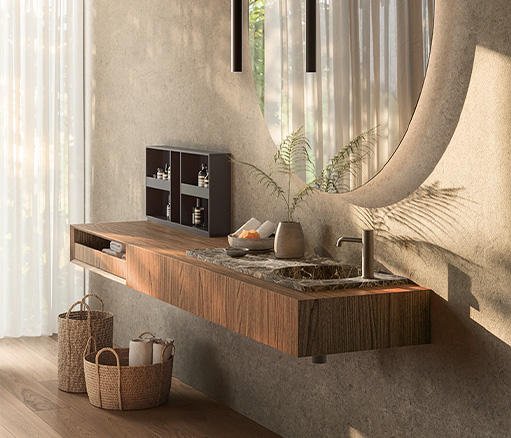 FLYER为浴室环境带来了简约优雅的设计理念。是追求简洁、实用风格而又不失品质的人士的理想之选。Flyer 提供由专用支架支撑的浮动架,由 Cristalplant、可丽耐、石材、大理石、花岗岩、Dekton®或 Inalco 的 MDi 以及实木等优质材料制成。每种材料都经过精挑细选,以确保其坚固耐用,外观精致。Flyer 梳妆台有实木、木饰面和实木等不同饰面可供选择,正面采用天然木板或涂漆木板,可完美适应任何浴室风格。梳妆台推开系统使 Flyer 既美观又实用