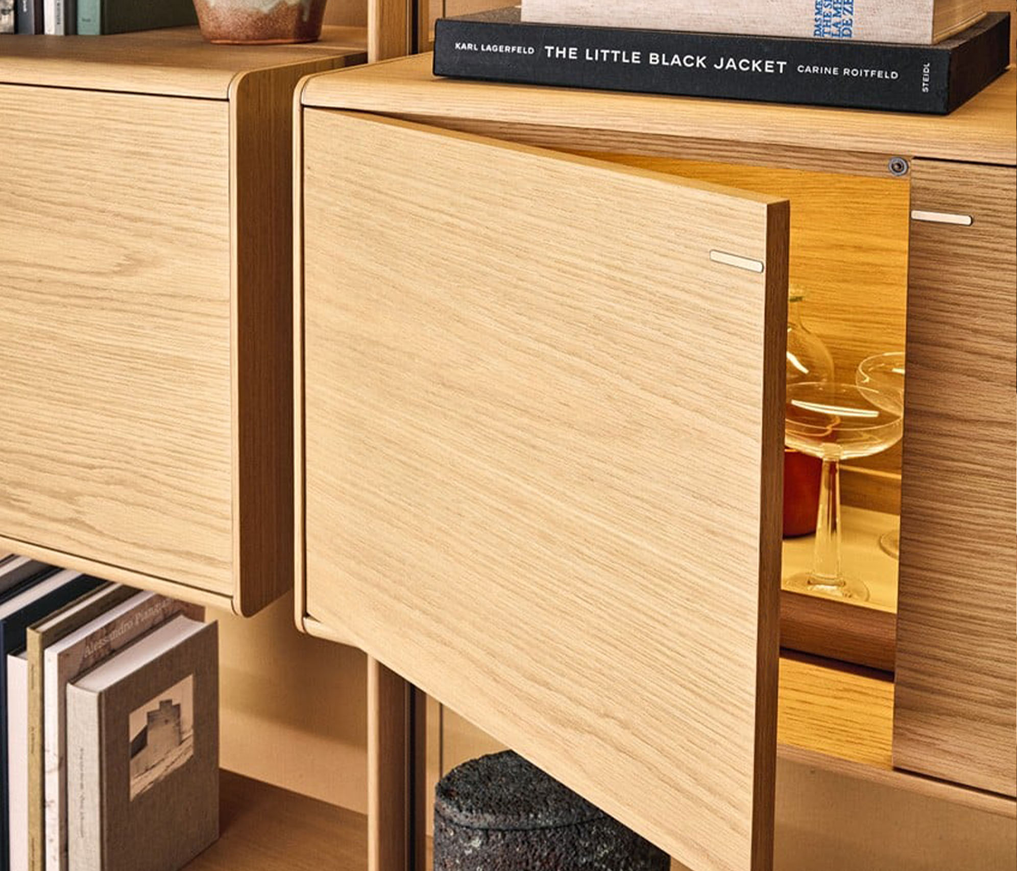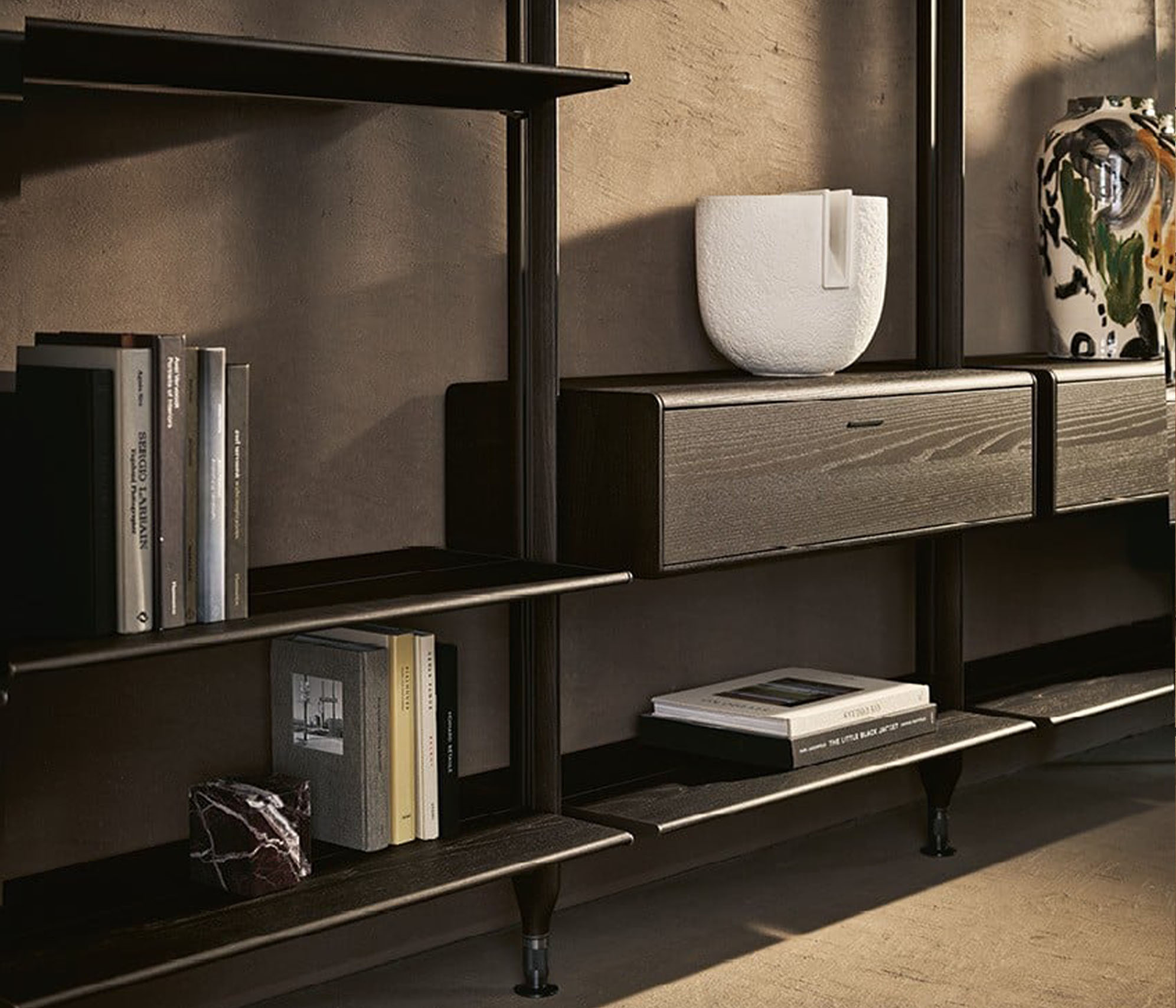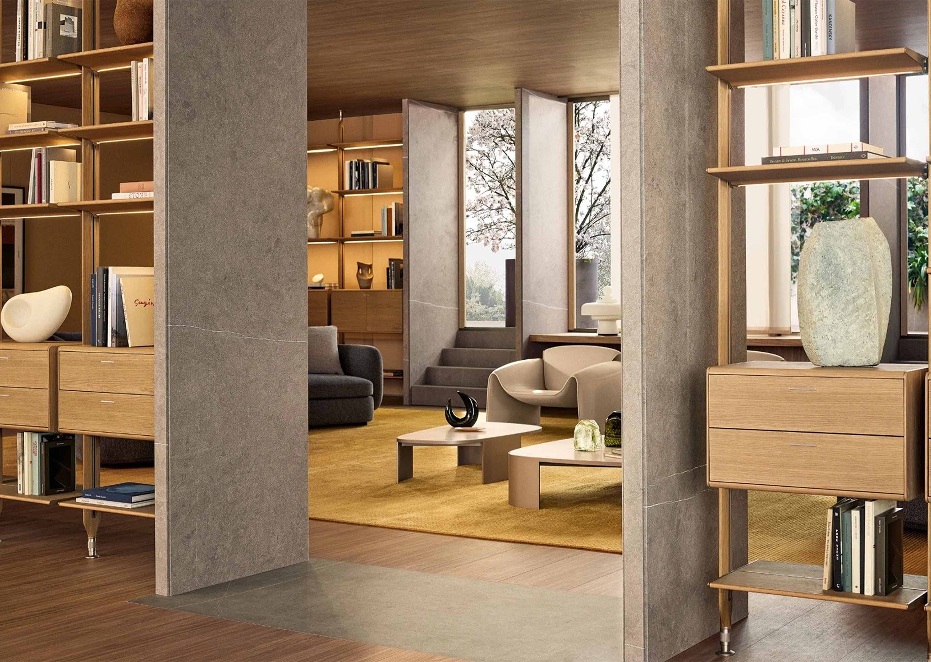 莱克星顿系统具有强烈的建筑内涵。它的特点是壁挂式和落地式,可根据需要的高度将带叶片门、抽屉或翻门的搁板和储物单元挂在上面。直立式有香槟色或阿尔代西亚漆面,也有金橡木和黑榆木,给人一种温暖的感觉。在天花板直立式款式中,该系统可以设计双面组合,在房间中央也可用于分隔空间。莱克星顿 "还提供夜用系统版本