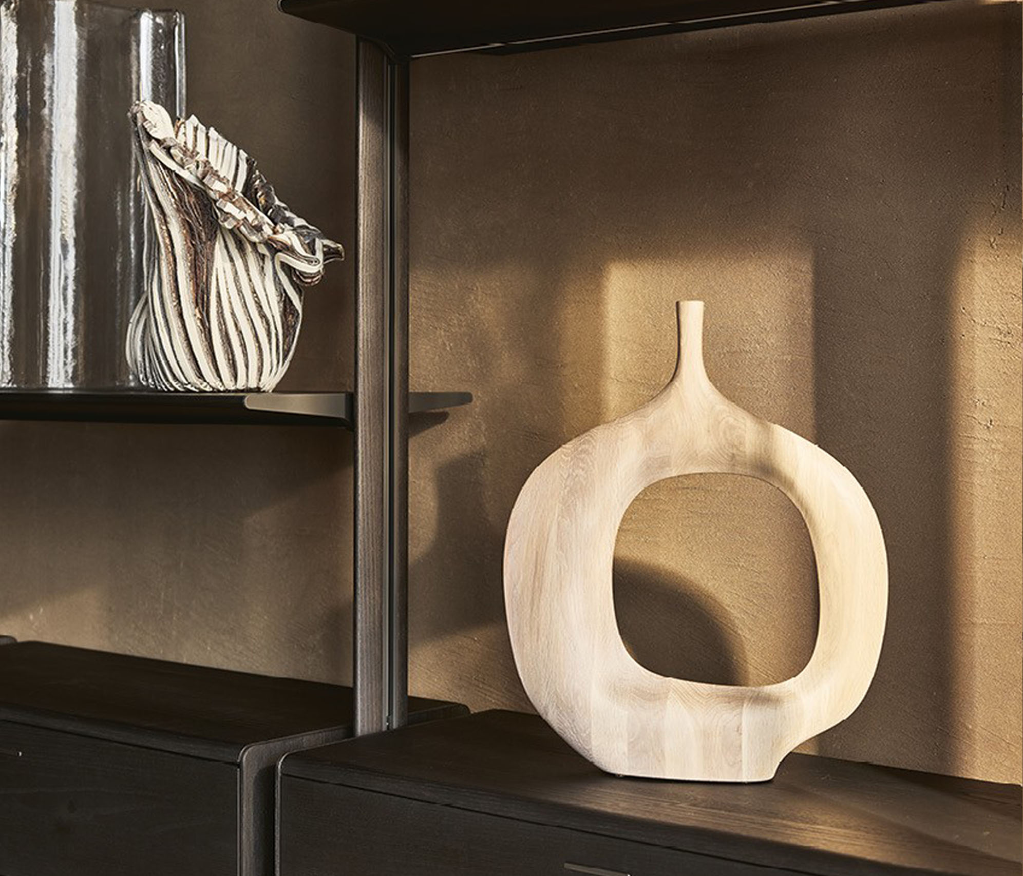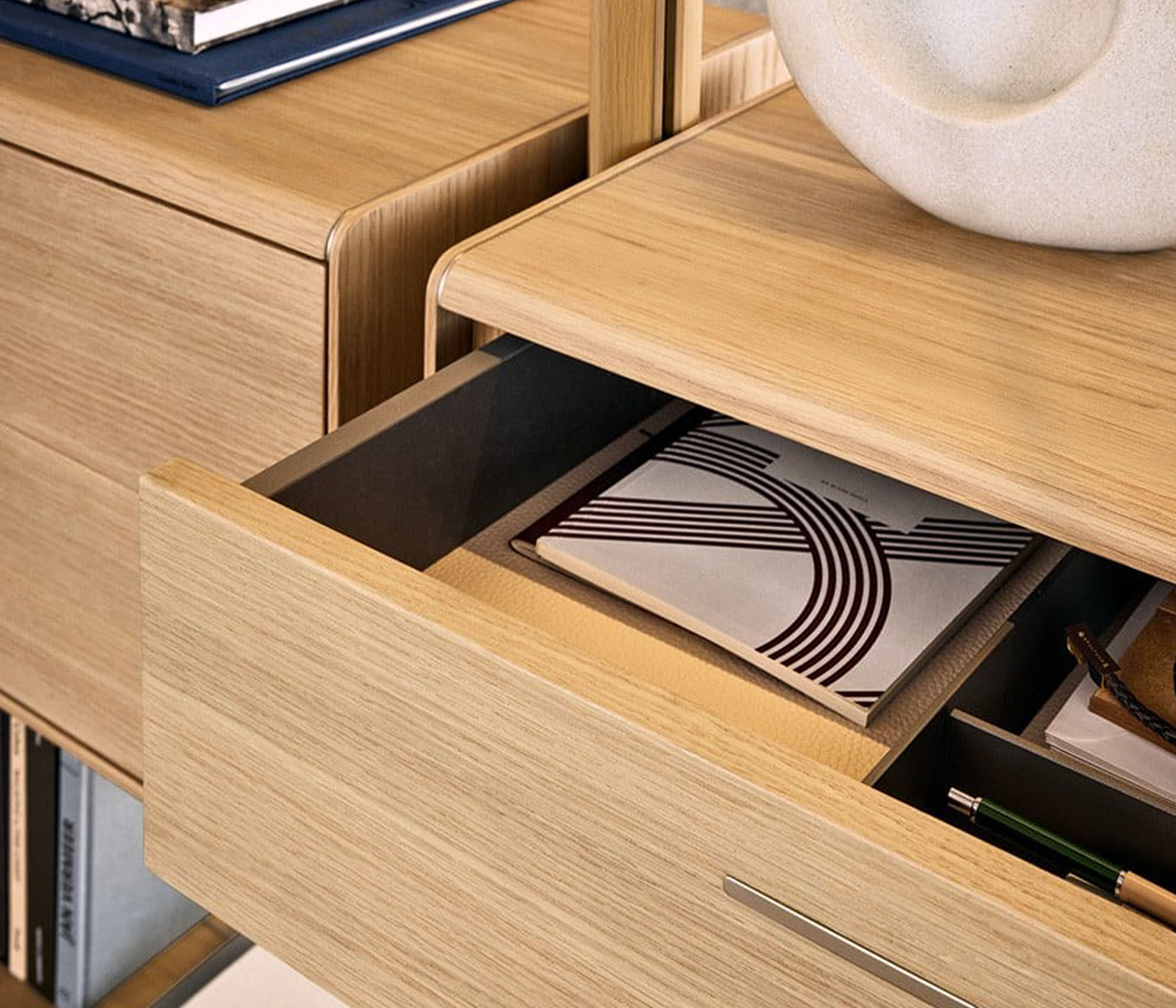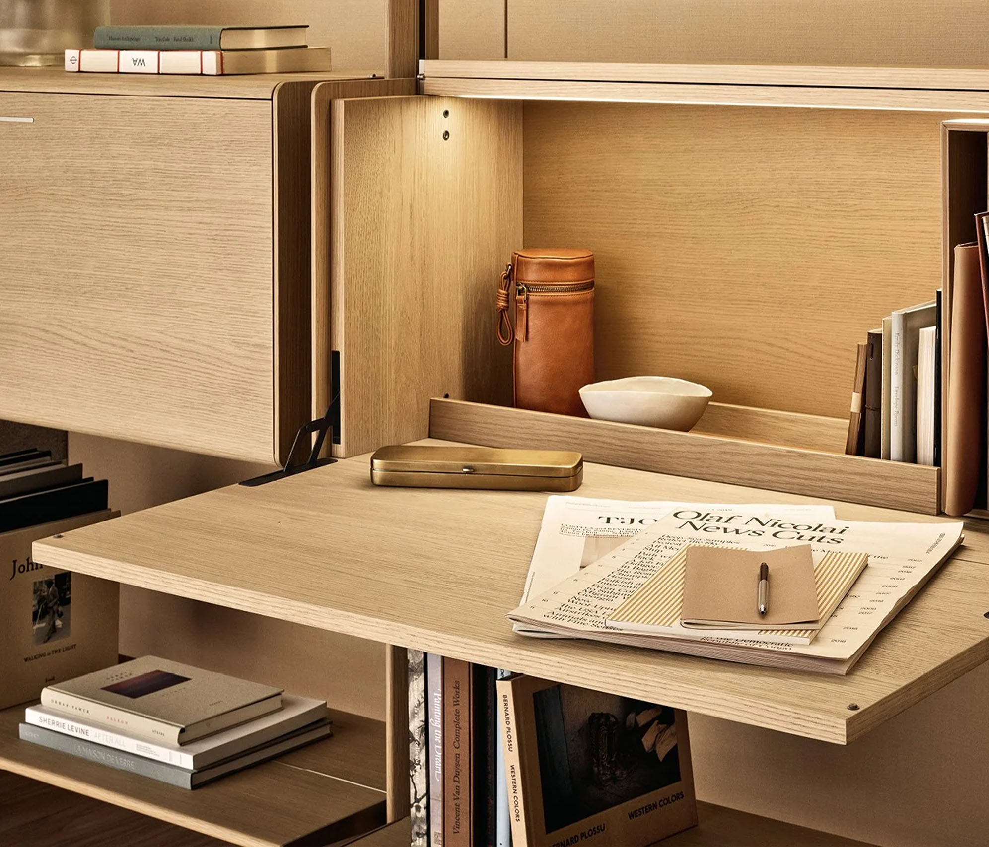 莱克星顿系统具有强烈的建筑内涵。它的特点是壁挂式和落地式,可根据需要的高度将带叶片门、抽屉或翻门的搁板和储物单元挂在上面。直立式有香槟色或阿尔代西亚漆面,也有金橡木和黑榆木,给人一种温暖的感觉。在天花板直立式款式中,该系统可以设计双面组合,在房间中央也可用于分隔空间。莱克星顿 "还提供夜用系统版本